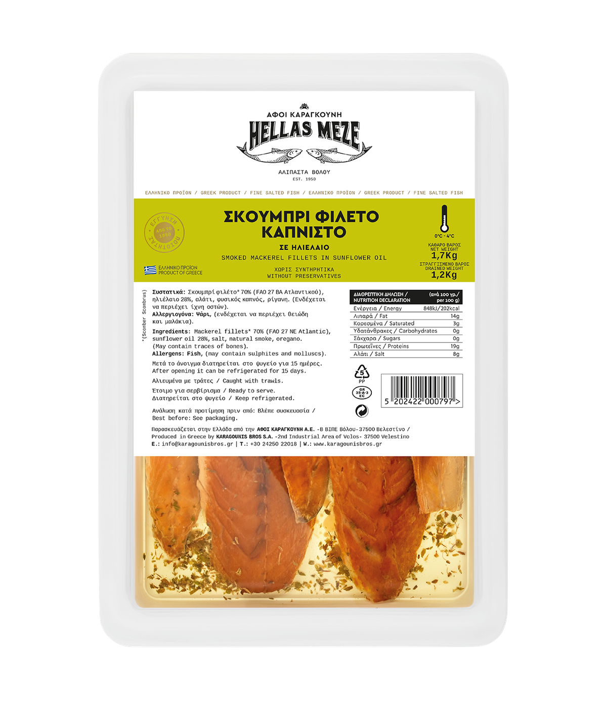 Τρυφερό φιλέτο από καπνιστό σκουμπρί φιλεταρισμένο στο χέρι που διατηρείται σε ηλιέλαιο εξαιρετικής ποιότητας χωρίς συντηρητικά, έτοιμο για να το σερβίρετε και να προσθέσετε στο τραπέζι σας ήπια καπνιστή γεύση που θα σας εκπλήξει.