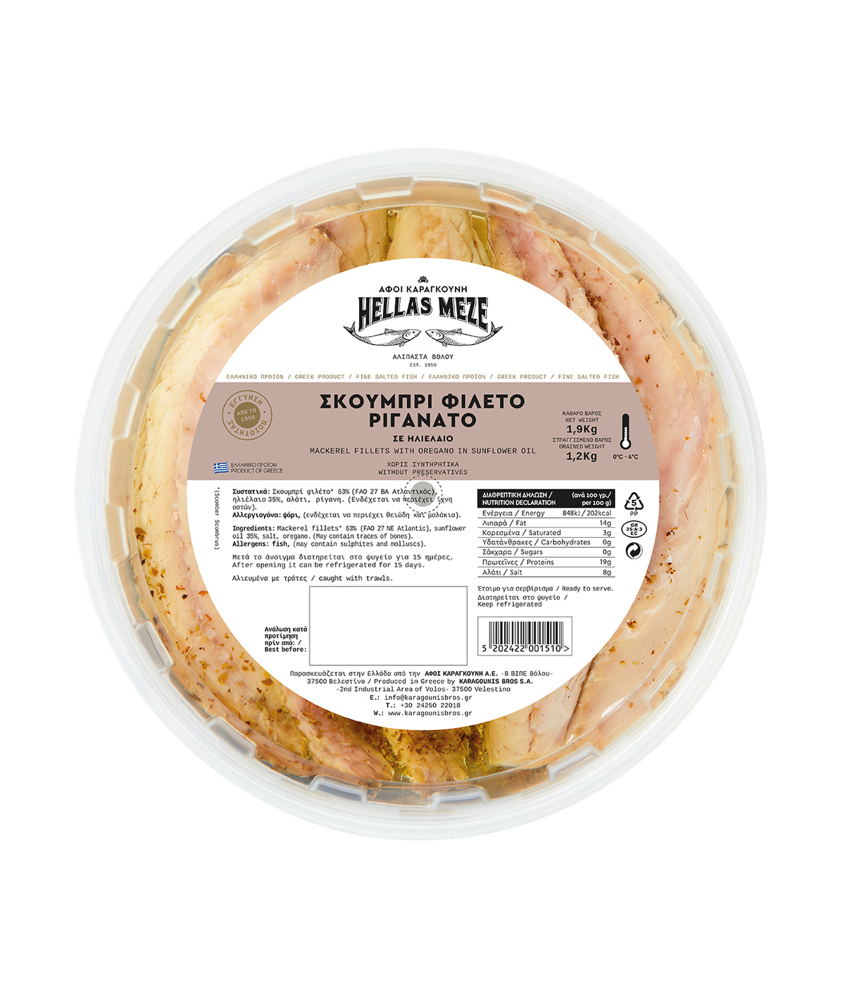 Εκλεκτά φιλέτα από σκουμπρί που καθαρίζονται στο χέρι, μαρινάρονται σε αλάτι, κατόπιν προστίθεται ρίγανη και διατηρούνται σε ηλιέλαιο, χωρίς συντηρητικά
